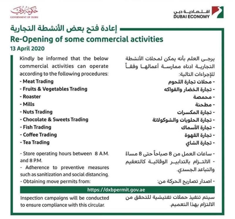 Please note the below Circular released by Dubai Municipality on 13 April 2020 relating to the permitted re-opening of range of commercial operations and activity. The title of each Circular is listed below, and can be accessed online.